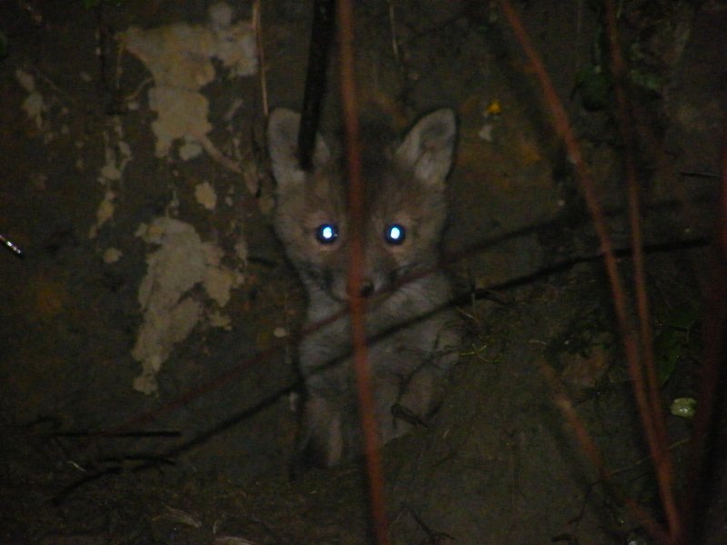 Odpoledne jdu kolem nory a uvidím pohyb. Dívá se na mně rezavá liška. Pak elegantně přeskočila kopeček a už jsem viděl jen oháňku mizící ve vsuku. Fotit jsem ale nestihl. Na večer přišla bouřka. Hned po ní jsem se vydal do lesa k noře. Červánky vydávaly velkou záři, takže bylo stále hodně světla. V 20:10 jsem zasedl k noře. O pět minut později jsem viděl, jak z nory čouhá ucho. Bylo to lišče. Opatrně vylezlo a jistí. Pak zase zalezlo. Pak vylezlo druhé, a začali si hrát. Já jsem fotil a fotil. Povedlo se jen pár fotek, protože jsem musel fotit s bleskem, který liščatům vůbec nevadil. Když jsem za úplné tmy odcházel, ještě jsem se zastavil u nory. I když pode mnou něco křuplo, liščata se zvědavě podívala ven a já od nich byl vzdálen asi 5 kroků. Naposledy jsem se na ně podíval a šel jsem domů.