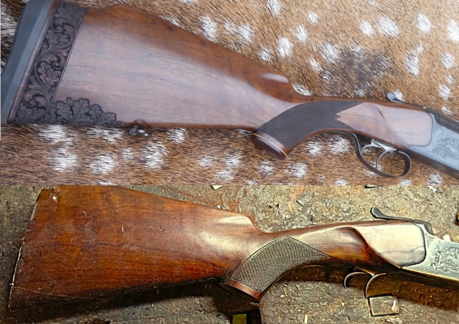 Prodloužení pažby - spoj maskován řezbou - poškození pažby na spodní straně u poutka - taktéž maskováno řezbou. Nová povrchová úprava a rybiny .