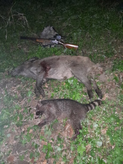 Zhruba každý třetí den kontroluji krmeliště, přihazuji kukuřici a nějaké dobroty. A pak se těším domů na prohlížení kartičky, co bylo za zvěř na krmelišti. Ve středu jsem provedl vše, co popisuji, no prasátka chodí. Zajímá mě jedna tlupa, kde je 5 lončáků a tři malá selátka. V hlavě mi probíhá: sakra, sakra, už měsíc se zde neukázal žádný mýval. Že bych je už polovil? Ale to ne, před měsícem na záznamu zde byly vidět. No prostě někam odtáhli. Zjišťuji, že okolo jedné ráno zde byla zmiňovaná tlupa divočáků. Takže večer asi ve 20:30 zasedám na posed. A ejhle ve 23:00 se na krmelišti objeví mýval. 4ka brok vykoná svojí super práci. A zase je o mývala méně. Tak se po měsíci ukázal. Balím saky-paky a odjíždím domů. V pátek kontroluju krmeliště a doma zjišťuji, že známá tlupa divočáků přišla v půl jedné po půlnoci. A ježkovi voči v půl druhé v noci opět mýval. Je rozhodnuto večer půjdu později až po 22. hodině. Ve 22:00 se oblékám do kapsy 2x brok a 4 kule. A samozřejmě zlaté Z-Háčko. Ve 22:30 usedám na posed a zapaluji mojí neřest – cigaretu. Dokouřím a podívám se pozorovákem a co mé oči nevidí, mýval! Jde pomalu ke krmelišti. Pozorovák vkládám do kapsy, zapínám parda a už mám mývala v kříži. Stojí na krmelišti naostro. Čekám, až se malinko vyhne. Ano teď. Mývalovi usazuji křížek šikmo na krk. Padne rána. Mýval v ohni odkazuje. 4ka brok opět super práce. Rychle slézám z posedu a jdu pro něj. Kdyby náhodou přišli čuníci, aby mi ho nesežrali. U žebříku pořídím foto. Pár rychlých zpráv kamarádům a hned pár přijatých gratulací „Lovu zdar“. No opět zmiňované cigáro. A uvidíme, jestli přijdou čuníci. Dám jim do půl druhé. Ráno máme brigádu sázení ovocných stromků. Což je v 7:00 stávat. Je půlnoc a slyším asi na 150m bekat srnce. Dobré znamení. A za pět minut slyším zakvičení. To už začíná lovcovo srdce zabírat na tepu. Z lesa vyběhli asi na 100m na louku čuníci a běží přímo ke mně na krmeliště. Zapínám parda. Zmiňovaná tlupa černé už je na krmelišti. Je to pět lončáků a tři selátka. Hledám bachyňku. Ano vidím jí. Jasně má tři struky. U jiného lónčáka vidím střapec. Je rozhodnuto 00:15 padne rána. Lončák běží asi třicet metrů a zhasíná. Kňourek 38kg. Následuje vše co po lovení probíhá. Což všichni dobře znáte. Do postele uléhám kolem půl třetí ráno. Ale opět s jedním nádherným loveckým zážitkem. Přátelé v zeleném, přátelé myslivosti, Lovu zdar.
