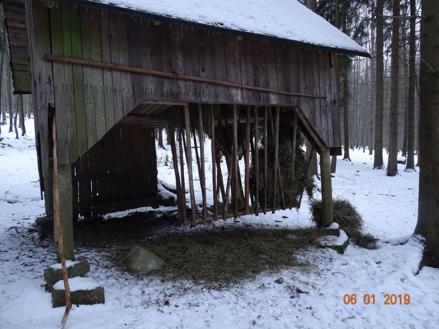 Ke krmelci se mě nastěhovala vysoká a pěkně mě seno probrala.Probrané seno z jeslí vyndám,dám je mezi dva kmeny,kde si je ještě doberou a do jeslí dám nové seno plné lístečků,pro srnčí ňam ňam.