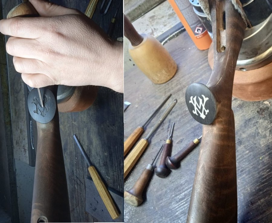 Kompletní obnova, změny tvaru, ebenové dřevo, monogram vyložený kostí, nové rybiny, olejová politůra.