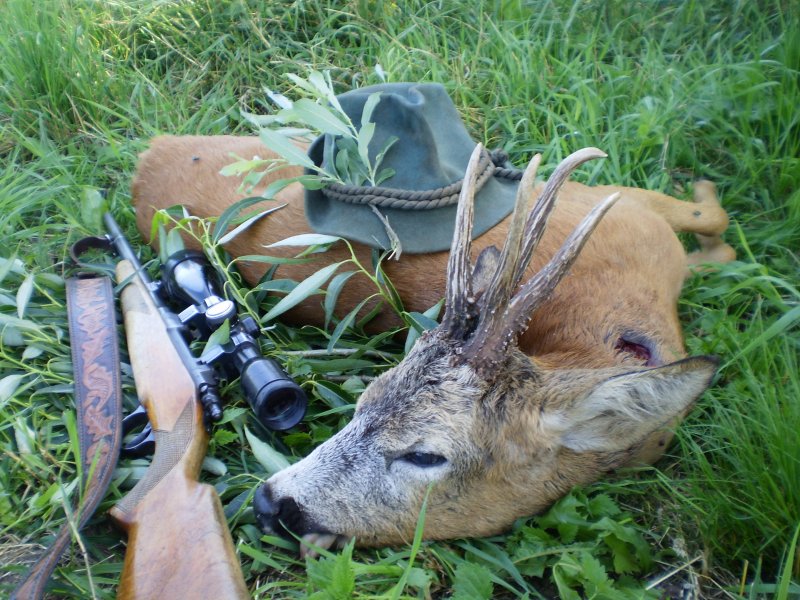 Tohoto srnce jsem pozoroval již v lednu, kdy sem tam navštívil naše MS. V březnu se ale ztratil a já se s ním definitivně rozloučil s tím že už se spolu letos asi nepotkáme. Tento týden v ranních hodinách při obeznávání srnce pro poplatkového hosta jsme u remízu v obilí vzdáleném 1,5 kilometru od našeho posledního setkání na sebe znovu narazili. Nemohl jsem uvěřit svým očím, následovalo rychlé a krátké našoulání a v okamžiku kdy se jeho silný krk objevuje v kolejáku mačkám spoušť a jeho životní pouť končí. Stojím nad ním a děkuji našim patronům že při mě stáli a že mi letos ještě takto nadělili. Myslivosti a lovu zdar.