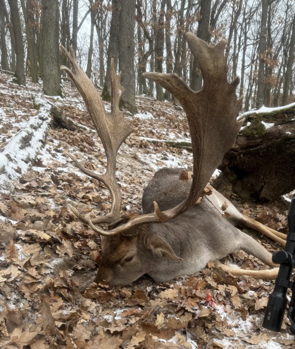 Jednoho lednového dne jsem si šoulal po lesní cestě proti větru, pod botami mi celkem silně křupal přimrzlý sníh a najednou v dáli mezi stromy vidím pohyb. Špičáci, dva, oba chovní. Tak si pomyslím, vy tady nebudete sami. Počkal jsem, až zalehnou a začal jsem se pomalu přibližovat. Když už jsem byl odhadem na 70m, tak je to přestalo bavit, začali se zvedat a dali se na pomalý odchod, viděl jsem, že jsou s nimi dva lopatáči, akorát jsem je nebyl schopen pořádně přečíst. Tak jsem sledoval jak odchází mezi stromy. Po chvíli se mi konečně postavili tak, že jsem je byl schopen přečíst. Když jsem v dalekohledu viděl, co má tento daněk na hlavě, byl jsem pevně rozhodnutý pro to, že jestli se šikovně postaví, budu lovit. Daňci stále nervózně popocházeli a jistili, kdo že je to ruší při polední siestě. Pořád se překrývali, až jsem si myslel, že už šanci na dobrou ránu nedostanu. Každopádně patroni stáli na mé straně a já dostal příležitost, kdy jsem měl vhodnou skulinu mezi kmeny stromů, abych mohl střílet. Ránu jsem mohl posadit jen na vysokou komoru a nejspíš i proto daněk po ráně zůstal v ohni. Hodnotitelskou komisí trofej ohodnocena na 163,42 bodů CIC, 5 let, průběrný. Uloven ve volnosti v Jihomoravském kraji dne 12.1.2026 ve 12:30.