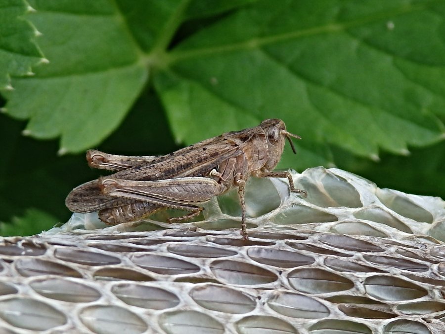 Chorthippus biguttulus - saranče na hadí kůžiDélka těla 1,5-2 cm. Celá hnědá, tmavěji skvrnitá saranče se silnýma zadníma nohama. Určení několika dalších, podobných druhů vyžaduje jisté zkušenosti. Stridulační aparát sarančí je tvořen zvláštní zubatou lištou na vnitřní straně zadních stehen a vyniklými žilkami na předních křídlech. Třením stehen o přední křídla vznikají zvuky na stejném principu, jako když přejíždíme hřebenem o hranu stolu. Stridulační aktivitu sarančí ovlivňuje počasí; jen za teplých a slunečných dnů je vrzání intenzivní a trvá dlouhé hodiny.