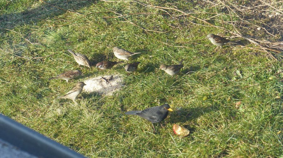 jeden kos a jedna paní kosová u nás na zahradě,víc najednou nevidím ...vrabci mají hlad pořád...sýkora koňadra a modřinka..dva dlasci nedaleko na modřínu ..vůbec nepřiletěli zvonci , čížci a další..je mírná zima , nemáme sníh, tak si najdou obživu v přírodě