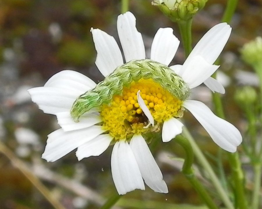 Cucullia chamomillae - zabarvení housenky se liší podle stupně vývoje.