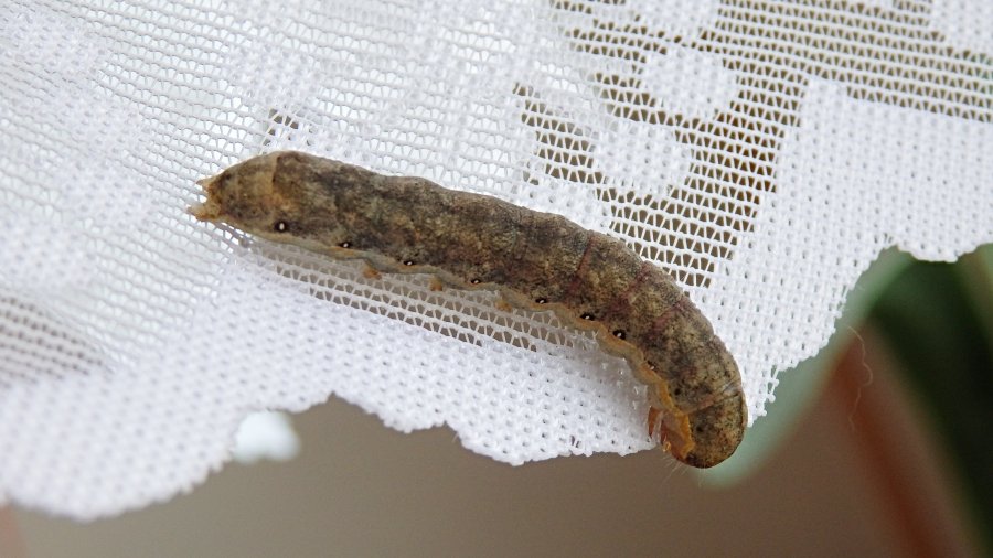 Mamestra brassicae - můra zelná se prozradí tmavě hnědým trusem, který zanechá na listech zelí. Larvy tohoto škůdce vyžírají chodbičky do hlávek zelí. Nejaktivnější jsou večer a v nočních hodinách. V jedné hlávce je jich nejméně pět a nejvíce nebezpečné jsou larvy druhé generace. Motýli z první generace se objevují v květnu, z druhé koncem léta a během podzimu. Samičky kladou vajíčka na spodní stranu listů.Můra na fotografii se objevila u mne doma (v 6. patře panelového domu) a spokojila se s listy hvězdníku. Prozradil ji také trus na parapetu.