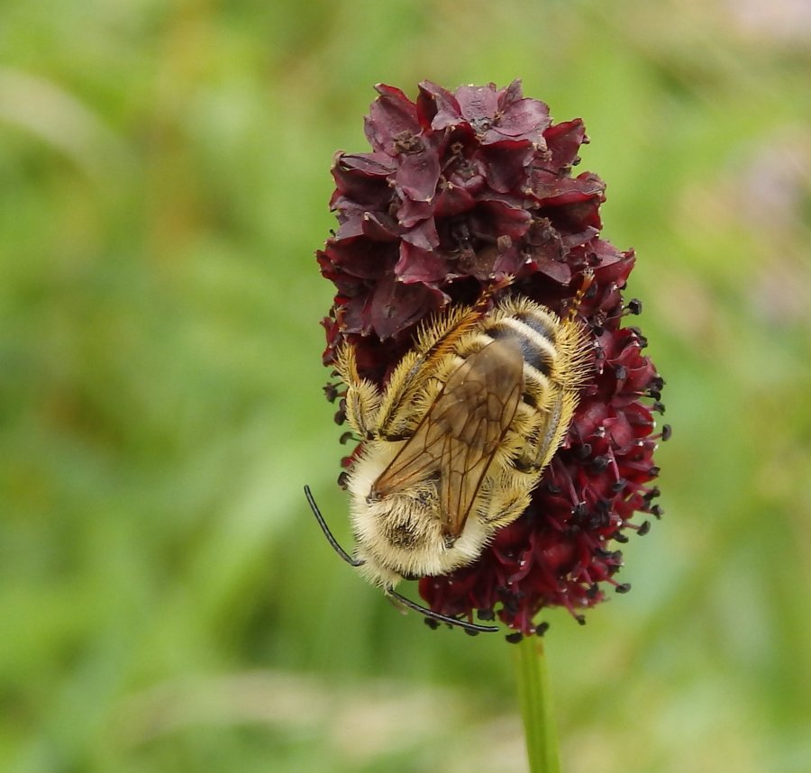 Dasypoda altercator (Harris, 1780) - Chluponožka chrastavcová je zástupcem z řádu blanokřídlého hmyzu. Patří mezi divoké včely samotářky. Blanokřídlí jsou hmyzem s proměnou dokonalou. Z vajíček se líhnou beznohé larvy, které se po určité době zakuklí, a z kukly se zanedlouho líhne dospělec. Je 12 až 15 milimetrů velká. Vyznačuje se dlouze obrvenýma zadníma nohama, na kterých může nahromadit velké množství pylu.Hnízdo pro potomstvo si buduje v zemi. Chluponožka chrastavcová vyhrabává v zemi až 50 centimetrů dlouhou chodbičku, která se větví a do každé komůrky uloží kuličku z pylu a nektaru a pod ní udělá takový stojánek z písku. K takové upravené hostině pak položí vajíčko a vchod zamaskuje tak, že byste ho nenašli. Hnízda včel samotářek se nacházejí prostě všude. V zemi, ve dřevě, ve zdech, ve střechách, v krovech, v pískovnách i lomech.