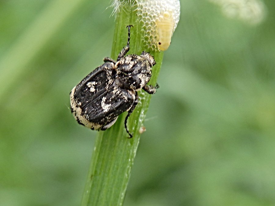 Setkání larvy pěnodějky (Cercopis vulnerata) s křivonožcem polokřídlým (Valgus hemipterus).