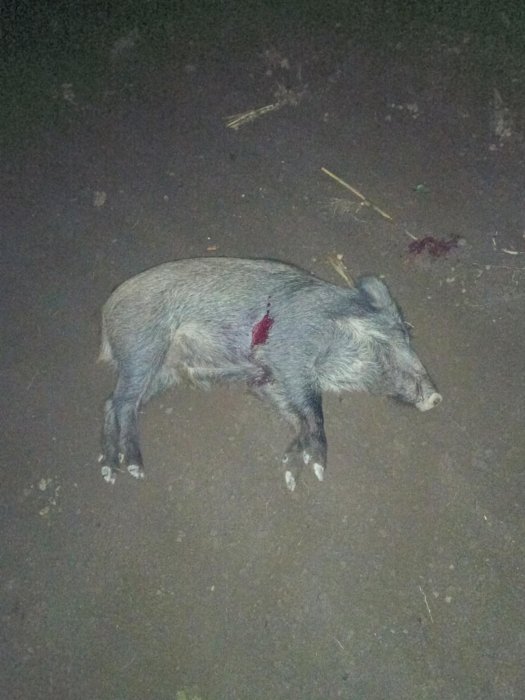 Foto z nástřelu. Po bezmála pěti hodinách čekání jsem se dočkal v husté mlze tlupy divočáků. Po ráně z kb ZH zůstalo sele v ohni. Střelivo Geco T-Mantel, ráže 7x57R.