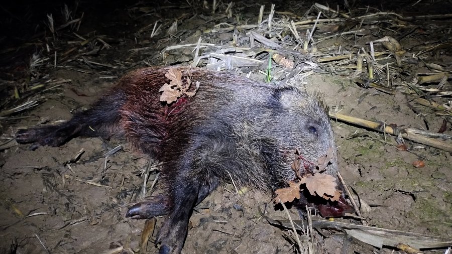 Rána z Carbinky je dnes zvukově tak akorát, aby přiměla tlupu k rychlému přesunu, jen náraz kule mi na těch 50 metrů uniká. Odbíhající tlupu sleduji dalekohledem, ale nezdá se, že by jich bylo zrovna o jednoho míň. Na poli žádnou kupu ležet nevidím, umístěním zásahu jsem si však docela jist. Vylézám z převleku a baterkou projíždím směr nástřelu i plochu kudy tlupa mizela a pomalu se mi ze rtů ztrácí úsměv. 30kilovou bachyňku nakonec najdu zhaslou o dost víc vlevo, než jsem myslel. Jak jsem ji tam dlouho vodil v plném zvětšení, přesunula se bokem více od tlupy.
