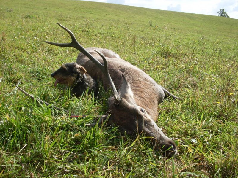 Jelena ulovil kolega.Na dosled jsem přišel zhruba po 40.hodinách od první rány,která byla zešikma na mněko a střela zůstala v zámku.Fena jelena stavěla asi 300m.od nástřelu.Rána na páteři je dostřelová.