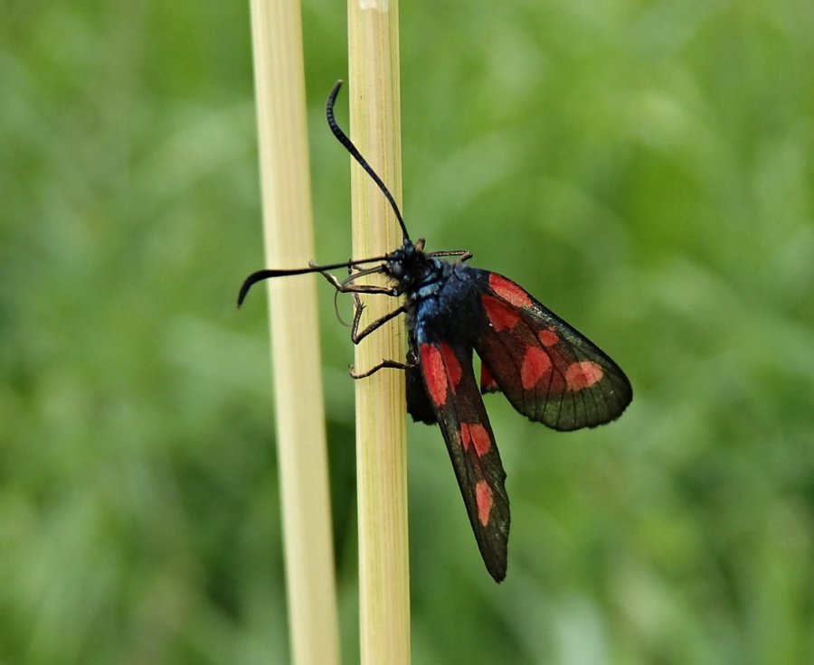 Zygaena angelicae - samec i samička má z lícní strany horních křídlech pět červených skvrn, na spodních červených křídlech má široký černý lem a špička tykadel je žlutá. Z rubové strany křídel mají obě pohlaví červené skvrny na horním křídle spojeny podélným pruhem.