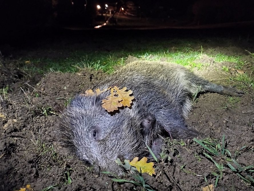 Půl hodinu před půlnocí se proti svahu ozývá slabé plesknutí. Slabší než jsem zvyklý. Žádné zvuky odpovídající zásahu, jen šustění tlupy velmi pomalu zatahující do lesa. Všechny odcházející kusy vypadají víc překvapeně, než zasaženě a už se jistě těší na jablka z nedalekých sadů. Baterkou projíždím drny přede mnou. Nikde nic ležet nevidím. "Na tuhle vzdálenost, jako vážně?" Podepíraný pirštokem vstupuji na gumový pás a popocházím výš. Zde naštěstí z jedné z vyrytých děr trčí a v odkazování se škubou zadní běhy. Zapínám na mobilu video kvůli dokumentaci a po pár metrech již postávám nad zhaslou 15 ti kilovou bachyňkou. Kolem ní se to v čerstvě naryté hlíně hemží žížalami. Tak s tímhle se fakt bojovat nedá, tedy dokud nezamrzne. Pokud je ta bachyně rozumná a při téhle velikosti bych ji to i přál, dá teď tomuto místu chvíli pokoj. Na úlomcích z přilehlého doubku už moc listí není, přesto mě doprovodí při posledním rozloučení. Zpáteční cestou zvědavý časovač znovu nasvítí celé dějiště, ale jen hnědo-rudá šmouha na gumovém běhounu a deset ušáků shromážděných pod nástupištěm vleku, vypovídají příběh, který se zde odehrál.