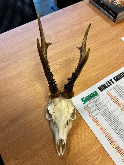 Parametry: délka lodyhy levá 21 cm, pravá 24 cm; přední výsada levá 7,5 cm, pravá 8 cm; zadní výsada levá 3,5 cm, pravá 4,5 cm, hmotnost lebky i parůžkama je 498 g. Děkuji za všechny komentáře.