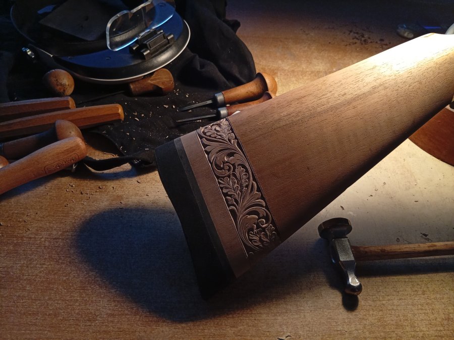 Prodloužení pažby na kulovnici, spoj maskován krycí řezbou ("zetka" Brno)