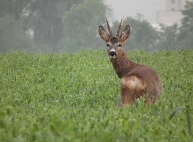 Bylo po dešti a srnec mi zapózoval na porostu hrachu.