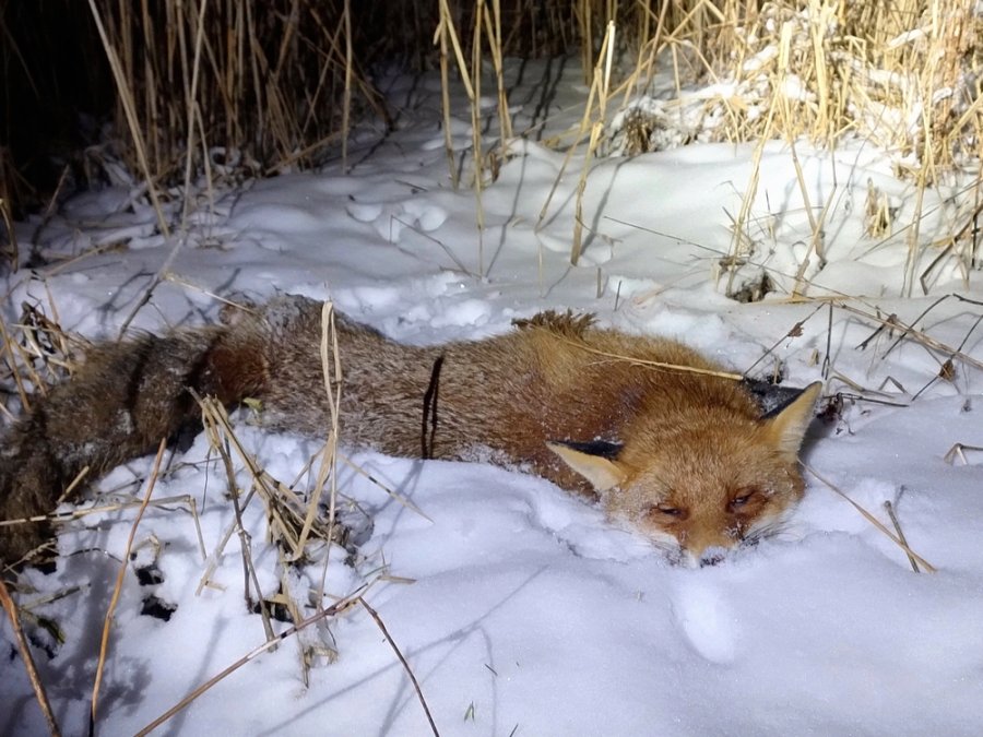 Konečně leží, společně s posledním nábojem v komoře. Ten zajišťuji a lezu dolů balit svršky napadané v rákosí. Celou dobu jsem lišku považoval spíš za menší, teď když ji však v 70 ti metrech zvedám ze sněhu, vím, že se k autu ještě řádně pronese. První rána šla hodně na spodek těla, druhá už byla přesnější. Šelma je navlečena v dosti kaňkováním už odřené srsti, ale bez známek prašiviny. Jen oháňku má divně bachratou, zacuckanou bodláčím. Podle zubů jde to ročního lišáka s málo zkušenostmi, i tak z něj mám velkou radost. Poděkování krom Diany, patří stejnou měrou mému, dnes už patnáctiletému Kubovi.