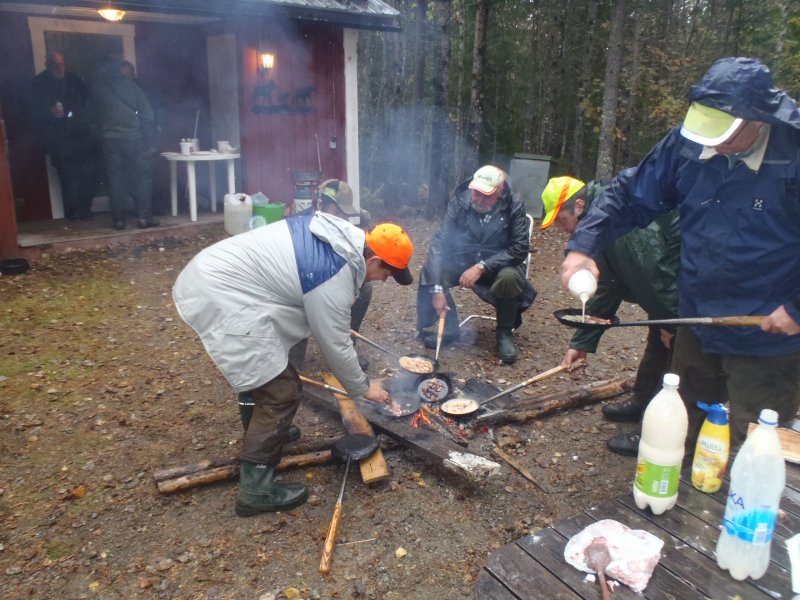 Každý lovec je vybaven speciální pánvičkou na které osmaží kostky slaniny které zaleje palančinkovým těstem doneseným v PET láhvi a po usmažení omelety je na ní nanesena pořádná vrstva brusinek.Zpočátku jsem byl trochu nedůvěřivý ale na lovu vyhládne tak jsem dvě placky zvládnul...