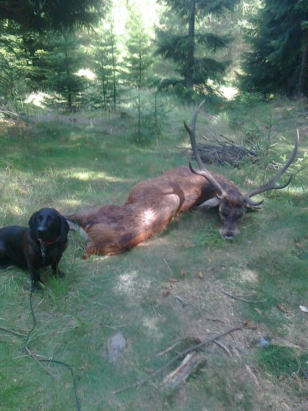 Uspěšný dosled jelena s mojí Hannoverskou barvářkou Calmou.Jelen postřelen na ostro na krk.Dosled po 18hod.od nástřelu cca 1500m.Dostřelen v potoku kde si chladil poranění.Jelen byl nerovný osmerák věk 8 let.