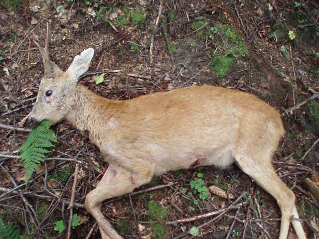 Dát či nedát.Tato myšlenka mě trápila delší dobu,ale nakonec jsem se rozhodl se sesvou hloupostí podělit.O tom to srnci jsem věděl od poloviny června.Srnec jevil známky špatné kondice byl apatický,jeho chůze byla divná a tak jsem o něm řekl hospodáři a ten povolil odlov.Na srnce jsem chodil ,ale jak to tak bývá srnec byl bud daleko nebo nevytáhl.Až ve čtvrtek 4.8.2011 jsem ho ráno našoulal.srnec byl asi 100 až 120 metrů odemně z kopce dolů srnec silně napadal na pravý přední běh chvilkama se mu podlamovaly obě kolena.Na nic jsem nečekal a zamířil a lesem se ozvala rána.Srnec značil nahrbením což pro mě znamenalo zásah na měko rychle přebbíjím a pozoruji srnce jde pomalu zhrbený proto zanířím a střílím znovu.Srnec se ještě víc nahrbý a mizí mi mezy stromy.Po cigaretě jdu na nástřel kde nenalézám barvu a jdu směrem kudy srnec odcházel.Srnce vidím asi 60m ležet u stromu má těžkou klimbající hlavu.rozhodu ji se jej dostřelit,ale jdu blíž s mím hendikepem není rána jistá,jsem asi na 30m když se srnec zvedá a odcházi ke srázu k potoku kde zalehá a jeho težká hlava padá a srnec se svaluje ze srázu dolů do potoko.Byl to velice smutný pohled na utrápené světla bolestí.Chtěl jsem ulehčit trápení a ještě jsem jej přidal.