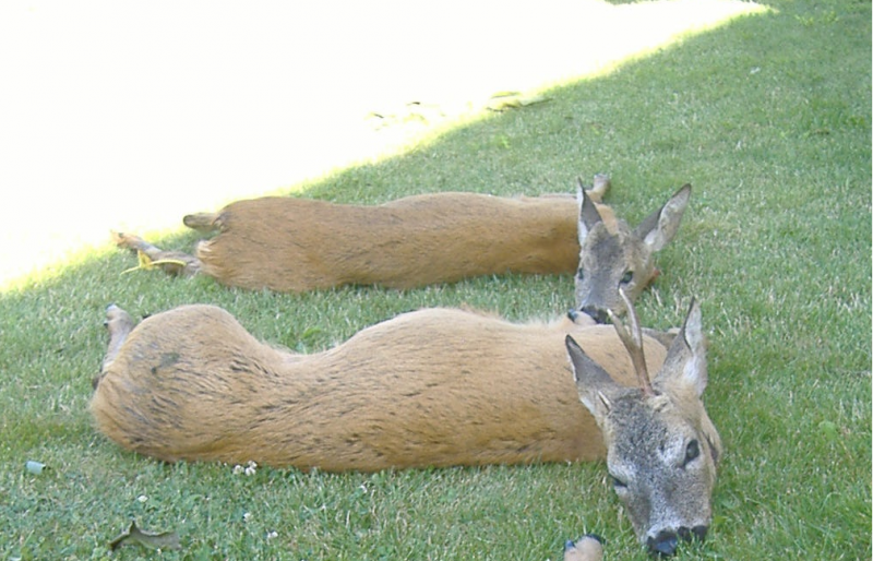 Psalo se 24. června 2008 a já se se svým otcem vydávám na lov srnců do krásných prostor jedné třebíčské honitby na lov srnců. Ani nedokážu popsat jak jsem se natu chvíli těšil, až zasednu na posed někde na krásném palouku a budu pzorovat naší nejhojnější zvěř. Po příjezdu na místo jsme se přivítali s panem hospodářem a kamarádem Petrem který byl náš hostitel a průvodce zároven. Táta dostal povolenku na všechny věkové třídy a já jelikož jsem tam byl poprvé pouze na jedničku stím, že v lokalitě ve které budu lovit se pohybuje srnec s jedním parůžkem. Místní na něj chodili už od začátku doby lovu a pořád bez úspěchu. Večer usedáme do mladého ovocného sadu. Sluneční paprsky pomalu ubírají na síle, když vtom z obilí do sadu vytahuje starý srnec III. věkové třídy. Z posedu pozoruji pana otce a pořád čekám kdy padne rána, ale marně. Srnec stále v klidu bere paši a pak tak jak přišel zase odešel. Po čekané to hned probírám s panem otcem a ptám se ho proč nestřílel. Odpověd byla okamžitá, nestřílel protože srnec si zasloužil dostat se do říje. Večer při dobré moravské slivovičce probíráme plán nadcházejícího rána. Já půjdu tam kam večer a táta s Petrem kousek opodál. Ráno usedáme do auta a jedeme do lesa. Byla mlha, že nebylo vidět nakrok. Tak tak jsem trefil na žebřík. Kolem páte hodiny mlha pomalu ustupuje a já se proto rozhodnu pro šoulačku. Potichounku slezám z posedu a šoulám lesní cestou směrem k velké pasece. Pomalýma krokama se dostávám k ní, kdež vtom mě zarazil velký vykotlaný smrkový pařez a hned pod ním pohyb. Byl to kus srnčího, ale co to jsem doposud nevěděl. Vtom vemě hrklo. Viděl jsem srnce vývrtkáče s vysokým parožím neuvěřitelně zakrouceným. "Nechám ho vylést z pozakryty pařezu na paseku" plánuji si v duchu. V tom se můj srnec krůčkem rozešel a já ted zase vidím, že je to srna. Kořeny, které visely z pařezu dělaly srnci siluetu vývrtkového paroží. Jenže kus udělal další krok a odkryl celou hlavu. Opět vemě hrklo, protože to byl právě srnec na kterého mě včera Petr posílal. Bleskově sundávám kulovnici z ramene ustaluji kříž a mlhavým ránem se nese výstřel. Srnec neznačí a běží po pasece do lesa a na jejím konci se zastavuje. Chvíli hledí směrem odkud šel výstřel a poté mizí v maliní. Srnce jsem chybil. Důkladně prohledávám nástřel, abych se stoprocentně přesvědčil o chybené ráně, ale opravdu jsem chybil. Den utekl jako voda a blížila se večerní čekaná. Petr šel tentokrát semnou. Usedáme na vysoký žebřík pod vlakovou stanicí vedle silnice. Celou dobu se nic nedělo jen pod posedem se honcovali dva zajíci. "Půjdeme šoulat na paseku, kde jsi ráno minul" pošeptal mi Petr a já se začal balit. V tom nad námi v lese zapraskaly větve a na louku vybíhá paličkáč a vzápětí asi čtyřletý šesterák. "Ulov toho čerta" znovu mi Petr šeptá. Honem ustaluji kříž na maličké hrudi ročního srnečka a zazní výstřel. Srnec značí komorovou ránu a odbíhá směrem k lesu kde asi po deseti krocích zhasíná. Po nezbytné chvilce docházíme k němu a Petr mi předává úlomek potřísněný barvou lámu zněj výhonek a podávám mu jej jako poděkovaní za doprovod na lovu úspěšném. Srnce jsme ošetřili odtáhli na hranu lesa a doprovod usuzuje, že je ještě dost času na šoulačku k pasece, která byla asi 150 metrů nad námi. Pomalinku kráčíme lesní cestou a naše tiché kroky ruší akorát bekání srnce na pasece. Už ho vidím, je na stejném místě u pařezu jako byl ráno než jsem na něj střílel. Doprovod srnce nevidí, ale pobízí mě k lovu se slovy " pokud je to ten z rána střílej" ještě se malinko deseti krůčky plížím k srnci ustaluji kříž a lesem se nese již druhý výstřel tohoto večera. Srnec po ráně zůstává v ohni. Docházíme k němu a zkoumáme jeho trofej. Na levé straně šesterák a na pravé straně knoflík. Znovu je mi předán úlomek a znovu zněj lámu část jako dík za doprovod. Ošetřujeme srnce a vtom nás vyruší dunívý výstřel. Panu otci se podařilo ulovit dobrého vysokého perleného vidláka ve stáří čtyř let. Byl to opravdu krásně stráveý víkend a rád na něj vzpomínám. Děkujeme kamarádovi za pozvání a také myslivecckým patronům za přízen při lovu. Lovu Dík!Roční srnec uloven na vzdálenost cca 70 metrů