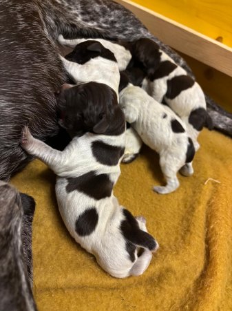 Dne 29.09.2025 naše "Ališka" vrhla 12 krásných hnědých běloušů německého krátkosrstého ohaře (NKO) v poměru 7 x fena a 5 x pes (s PP). Rodiče štěňátek jsou skvělí parťáci do rodiny, ale hlavně jsou skvělí i na práci v myslivosti (dle přiloženého letáku).