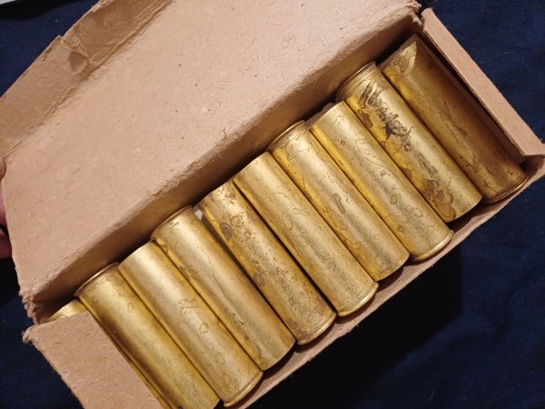 Prodám krabici 50 ks ruských mosazných nábojnic ráže 16, nepoškozeno, probaleno ještě z výroby hedvábným papírem.