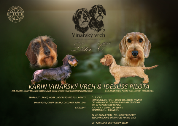 Typ: NorníciNabízíme štěňátka jezevčíků drsnosrstých standartních s PP z CHS Vinarský vrch ze zahraničního krytí, z exteriérově i pracovně vynikajícího spojení - Karin Vinarský vrch a Idesüss Pilóta. Předpokladem po rodičích a předcích jsou skvělé povahy,výborný exteriér,vlohy pro práci.