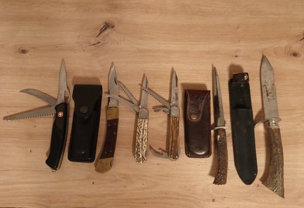 Prodám použité lovecké nože s pouzdry viz.foto.Nože jsou částečně zbroušené,ale po technické stránce v pořádku.Řezivost mají.Prodám pouze jako celek.Zašlu nebo dovezu po trase Jeseník-Ostrava.