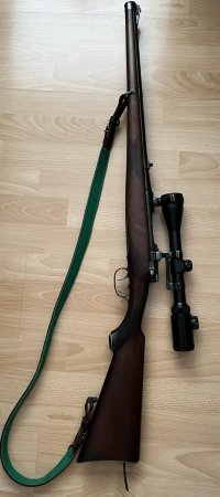 Celopažběná kulovnice STEYR Manlicher 7x57, celková renovace, nová hlaveň. Puškohled LUGER 3-9x40, červený bod, Ručně na zakázku dělaná klapková montáž, napínáček, zásobník na tři patrony v pažbě. Krásné dřevo, nádherná zbraň.
