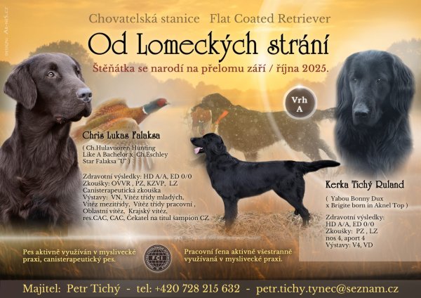 Typ: SlídičiCHs od Lomeckých strání. Nabízí volná štěňátka plemene Flat Coated Retriever s PP.