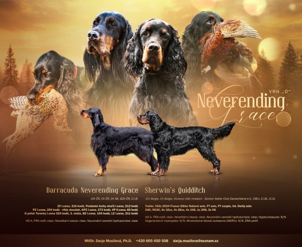 Typ: OhaříNa základě výborných výsledků z předchozího vrhu opakujeme spojení dvou vyrovnaných, typických a zdravých jedinců plemene gordonsetr. Minulý vrh potvrdil kvalitu – potomci vynikají silnou loveckou vášní, výbornou ovladatelností, skvělým temperamentem a typickým exteriérem. Matka štěňat je pravidelně využívána v praxi při honech na kachny a bažanty. Otec štěňat má složené zkoušky s přinášením v Německu a ve Francii. Oba mají nadstandardní zdravotní výsleky a jsou oba plnochrupí. Ověřená kombinace nepříbuzných linií znovu slibuje štěňata s výbornými pracovními i povahovými předpoklady.