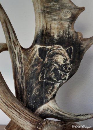 Gravírovaný motiv na daňčím shozu.Cena: 2200 Kč