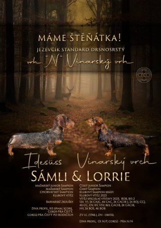 Titulem WUT Světové vítězky, BOB ze Světové výstavy jezevčíků Itálie z roku 2016 se pyšní máma naší Lorrie Vinarský vrch - Holly Vinarský Vinarský vrch.
