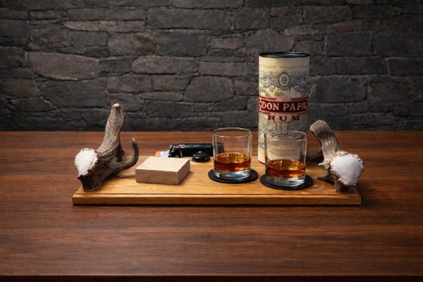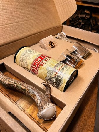 Prkénko z dubové spárovky s úchyty z dančího paroží, 7letý velmi oblíbený filipínský rum Don Papa, dubová kostka, dvě skleničky a hořáček k opálení. Ne jen věci. Rituál.