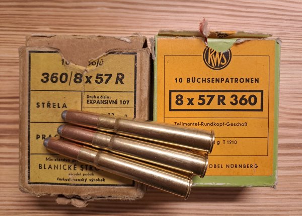 Prodám zbylé náboje 8x57R/360- 47 ks, již nevyužiji. Krabičky nejsou originální k nábojům. Střela je 12,7 g