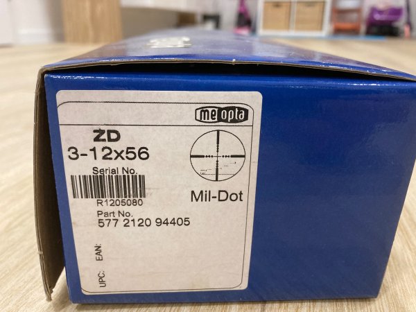 Prodám zaměřovací dalekohled Meopta ZD 3-12x56 se záměrnou osnovou Mil-Dot, pořízen v roce 2012, používán příležitostně několikrát do roka. Puškohled umožňuje červené podsvícení kříže s volitelnou intenzitou. V roce 2019 proběhla na puškohledu odborná údržba u optika - kontrola a vyčištění. K puškohledu dodám i ocelové kroužky k montáži na weaver lištu. Součástí dodávky je i přední klapka. Přístroj je plně funkční, avšak obsahuje drobné mechanické poškození těla tubusu od montáže - viz foto. Důvodem prodeje je pořízení nového přístroje.