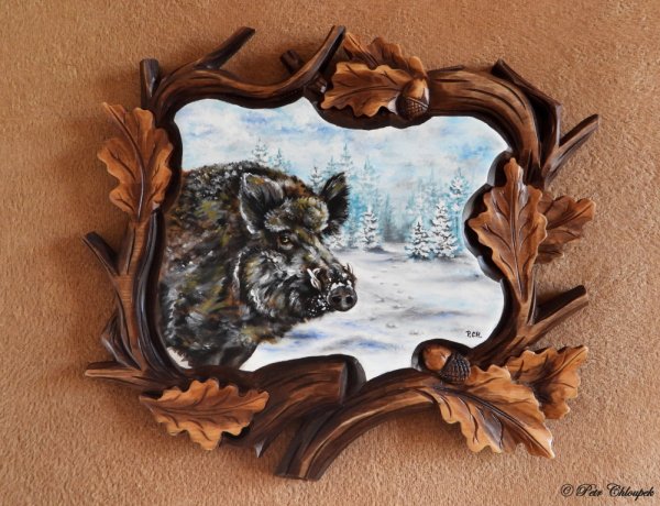 Akryl na řezbované podložce.Cena: 2600 Kč