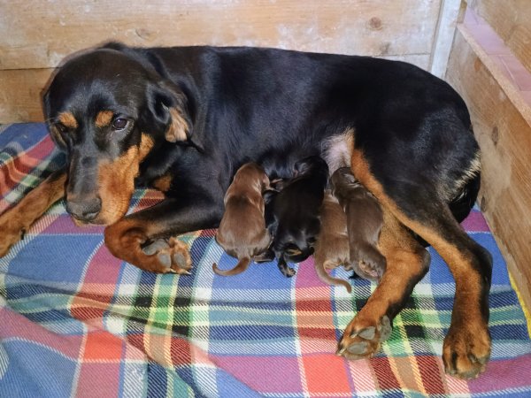 Otec Toszago Leśny Amok- čokoládový pes z Polska lovecký vedený, Matka Pola z Beskidzkiego Matecznika- zkoušky ZVVZ, BZH, HZ 1. ceny, LZ 2. cena, Mezinárodní výstava V1 CAJC, CACIB-J, BOJ, Klubová výstava V1 CAJC,intenzivně lovecký vedená fena. Oba rodiče hlasití na stopě, přátelský, nekonfliktní, ostří na černou