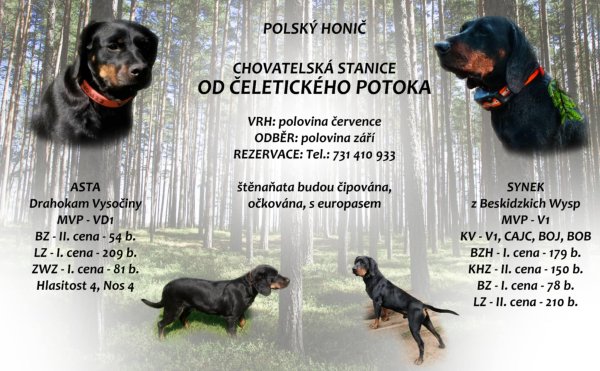 Prodám štěňata polského honiče z chovné stanice Od Čeletickeho potoka ze spojení Asta Drahokam Vysočiny a Synek z Beskidzkich Wysp. Oba rodiče jsou aktivně vedení k lovu a zároveň to jsou rodinní parťáci. Polský honič je klidný, oddaný a odolný lovecký pes. Díky své snadné cvičitelnosti je vhodný i pro začátečníky. Mám čtyři volné psíky a je možné si je ihned odvézt. Jsou čipovaní, očkovaní, odčervení a s českým očkovacím průkazem.